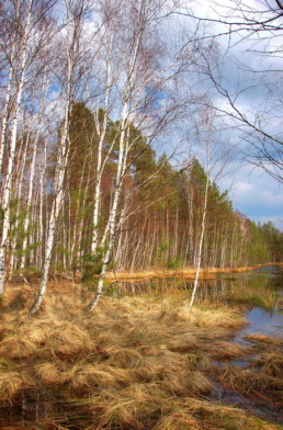 Scattered among these woods are extensive marsh complexes: mesotrophic bogs, dominated by sedges, cover about 1,600 hectares; oligotrophic bogs span over 400 hectares. In total, open mires (including a re-wetted, abandoned polder in the center of the reserve) make up about 18% of the area. The remaining 2% is a mix of meadows and water reservoirs. Dry grasslands appear in small fragments on the edges and in clearings, with scrubs and heathlands scattered sporadically throughout.